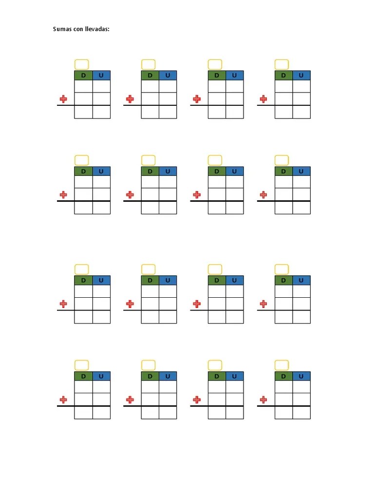 Practica sumas llevando (o sumas con llevadas) con estas fichas preparadas para imprimir.